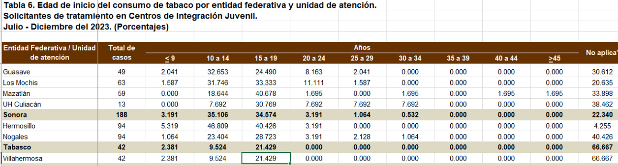 Tabla 1. Edad de inicio del consumo de tabaco por entidad federativa. Fuente. INEGI (2023)